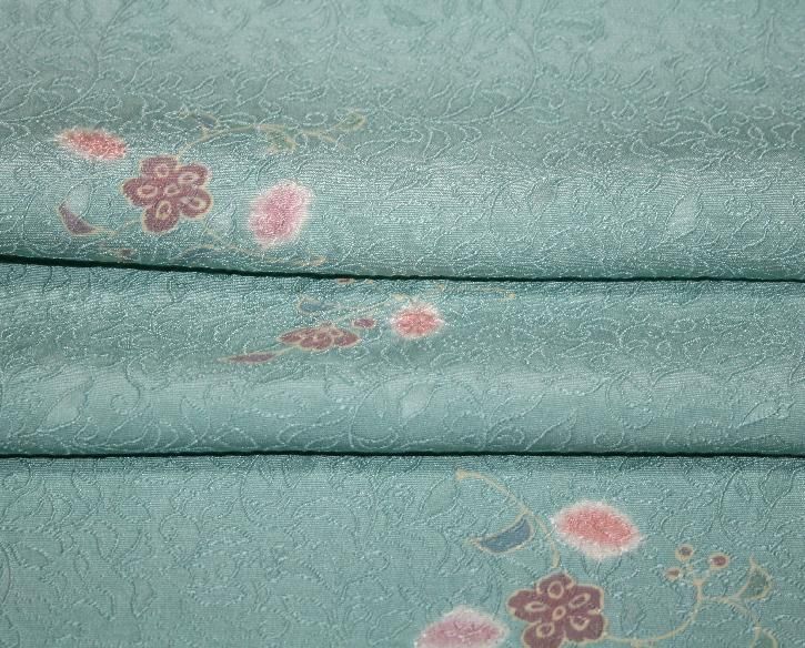どっしりした紋意匠生地。爽やかで明るいアクアグリーン色、可愛い小花柄を散らして
