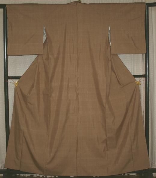 ひなびた民芸調の地風、渋い胡桃色の結城紬色無地着物です