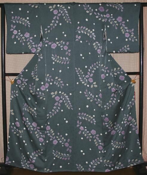 錆鼠色帽子絞り枝花模様小紋着物(お勧め品です)