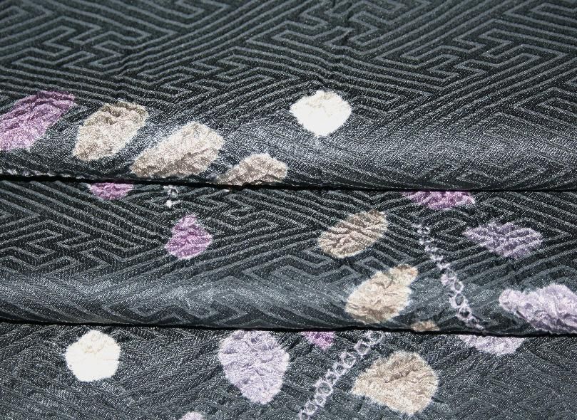 錆鼠色紋綸子生地。枝花模様の帽子絞り小紋着物です