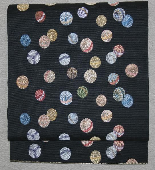 黒地に手まりずくし文様の六通(通し模様)袋帯です