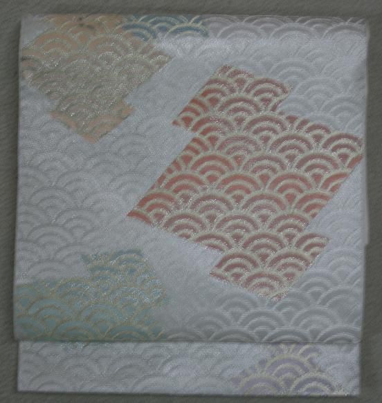 青海波に淡いパステル色彩の松皮菱柄の気品ある袋帯です