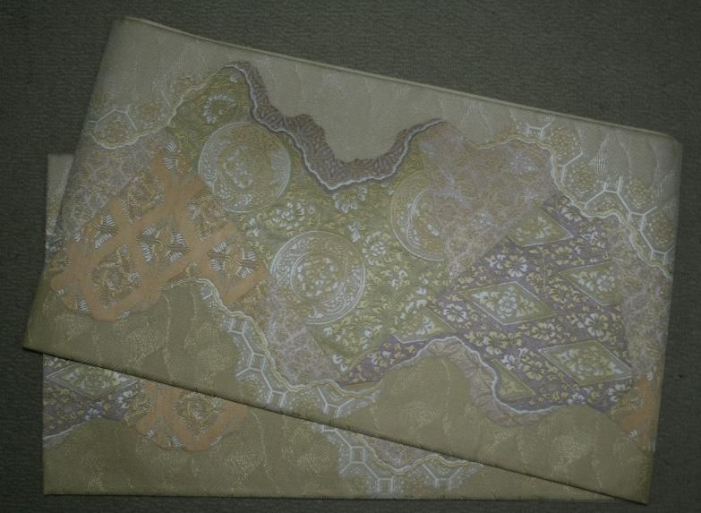 爽やかな黄練色、道長模様六通(通し模様)袋帯です