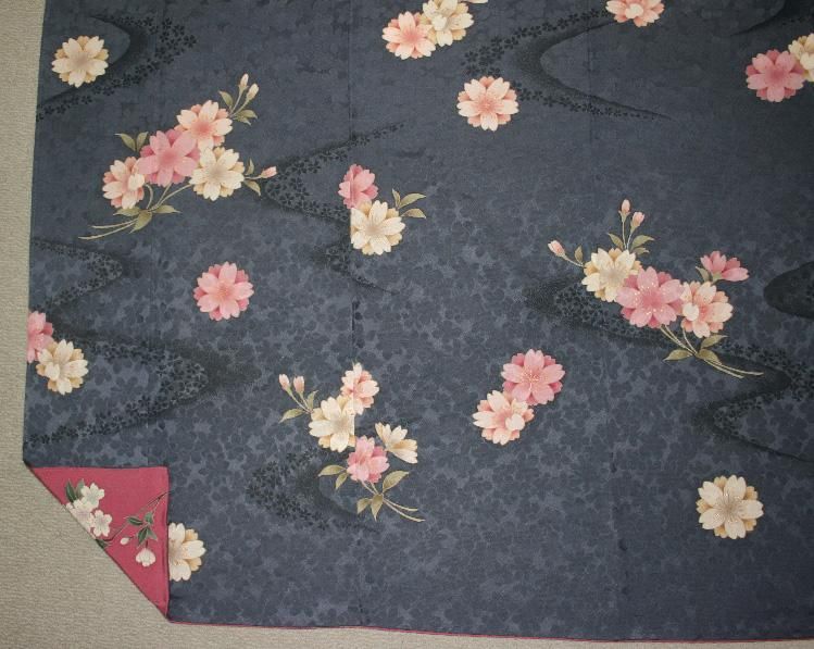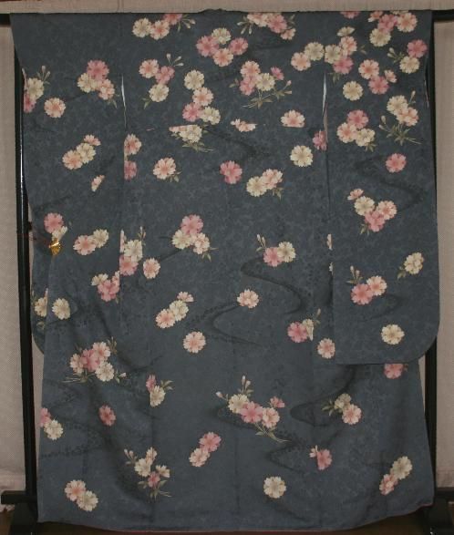 錆鉄御納戸色小花散らし本振袖・正絹襦袢付(希少品です)