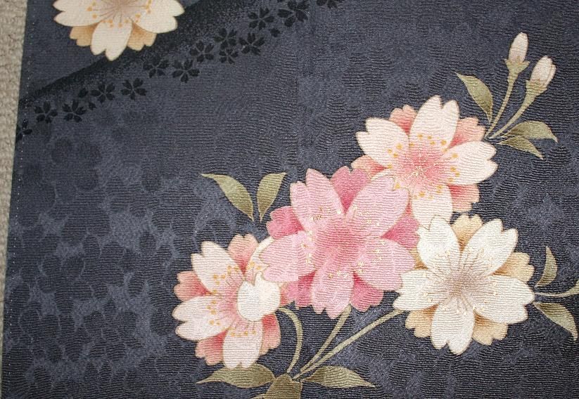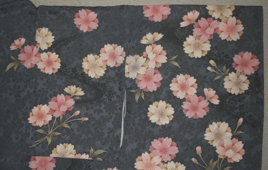 どっしりした紋緞子生地、シックな錆鉄御納戸色に可愛い小花模様を全体に