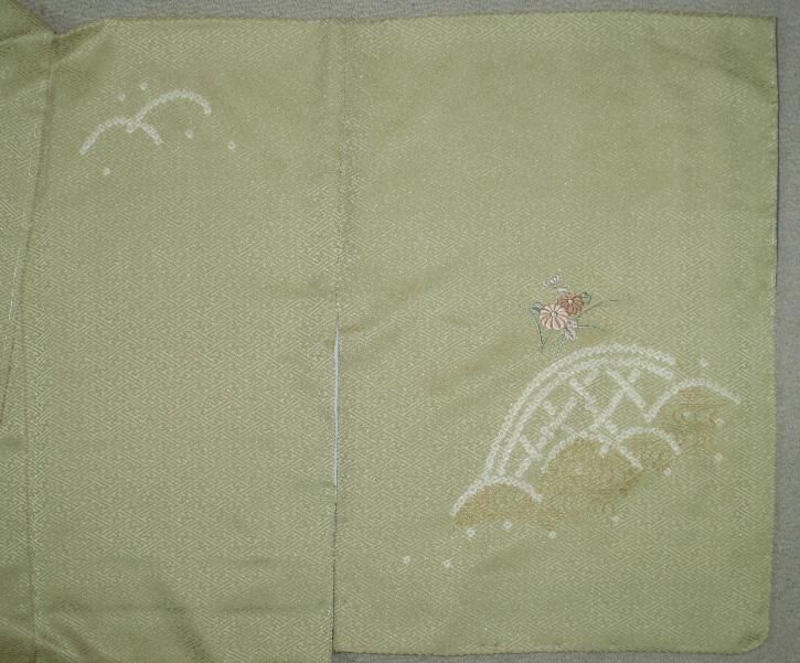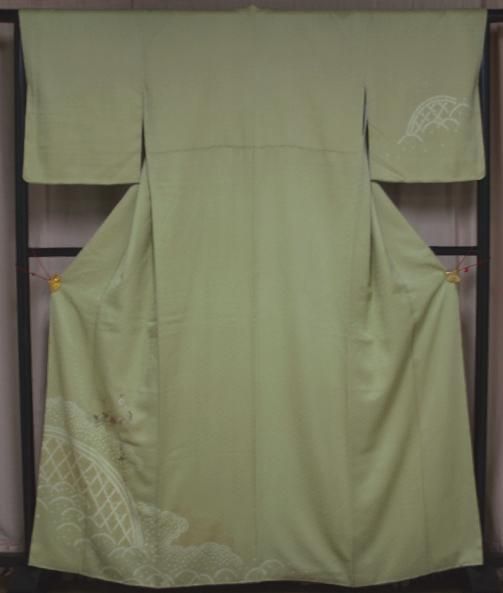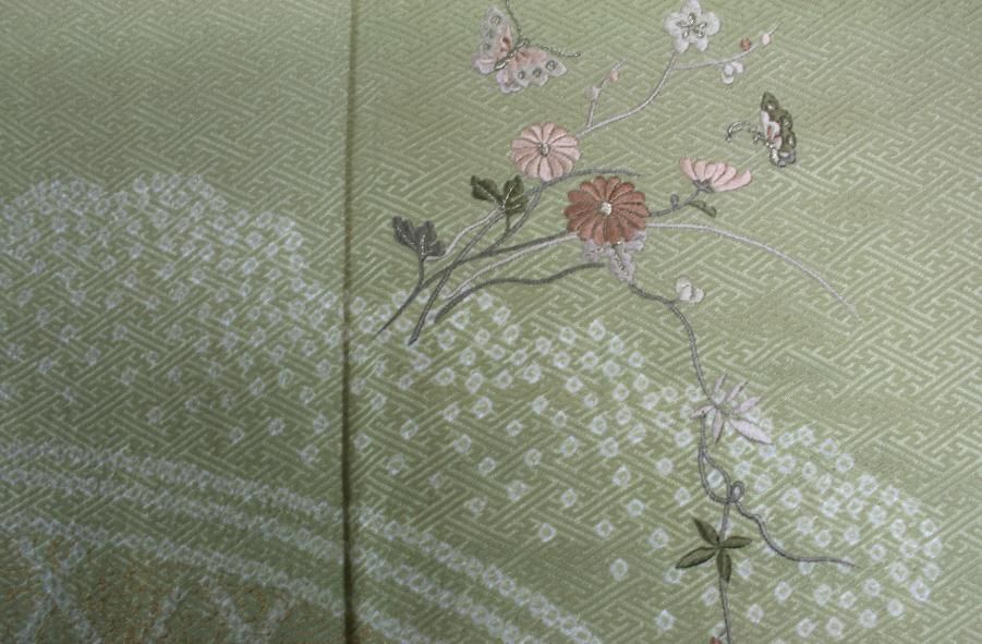 未使用の若菜色絞りに刺繍付け下げ着物