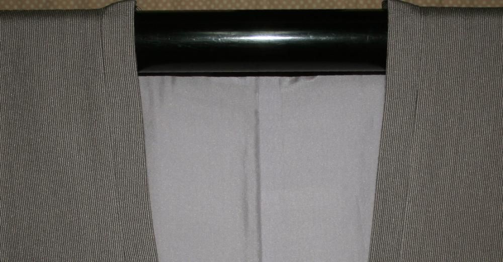 薄ローズグレイ駒無地生地。万筋江戸小紋柄のロング道行コートです