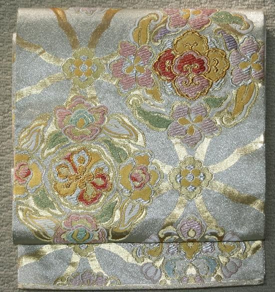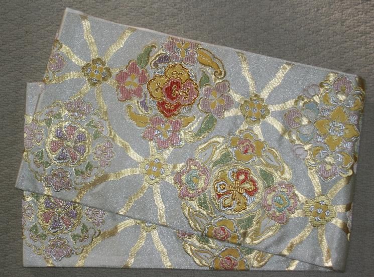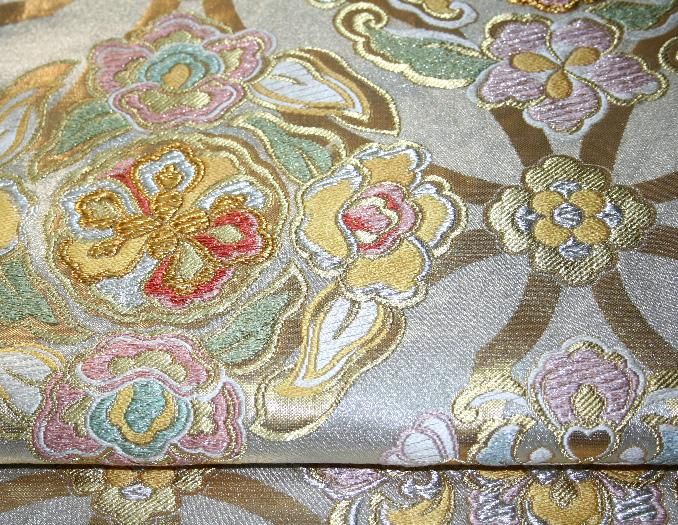 白銀地、カラフルで豪華な華紋文様の六通(通し模様)袋帯です