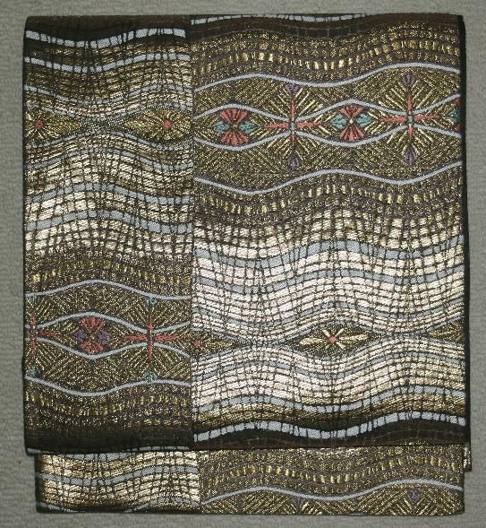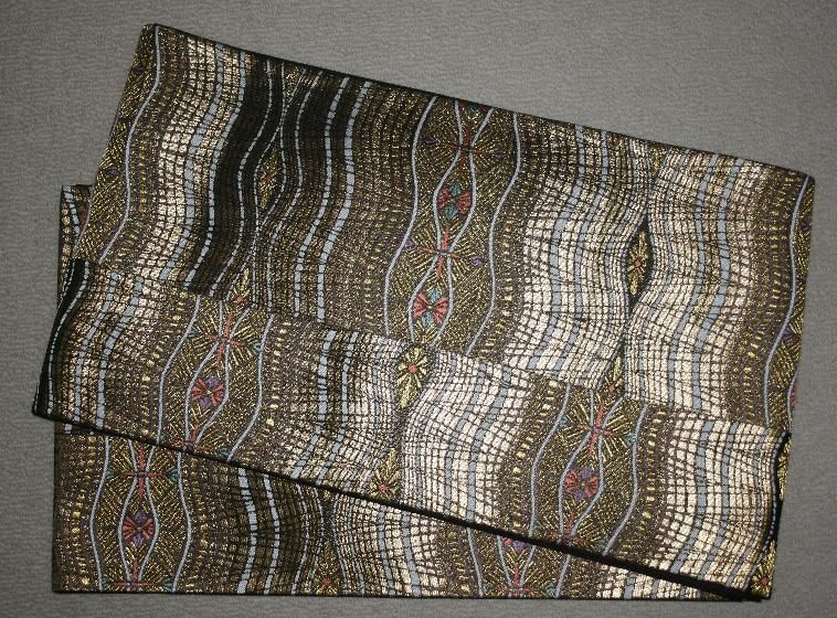 シックな金地、抽象文様の六通(通し模様)袋帯です