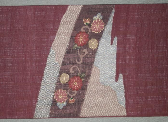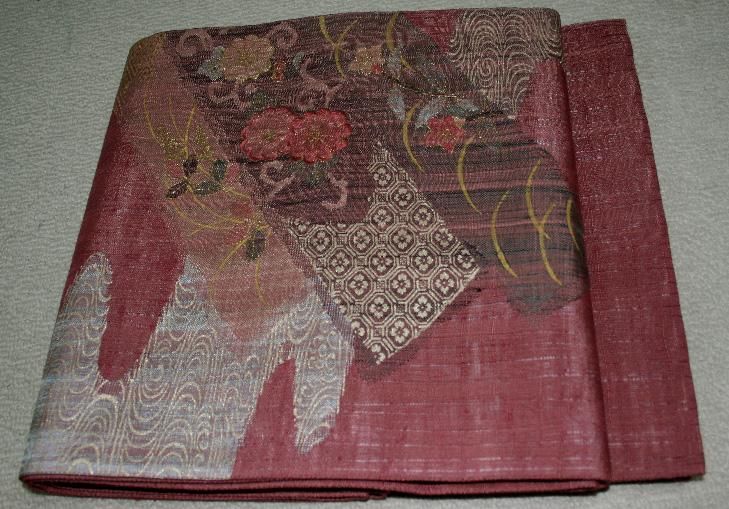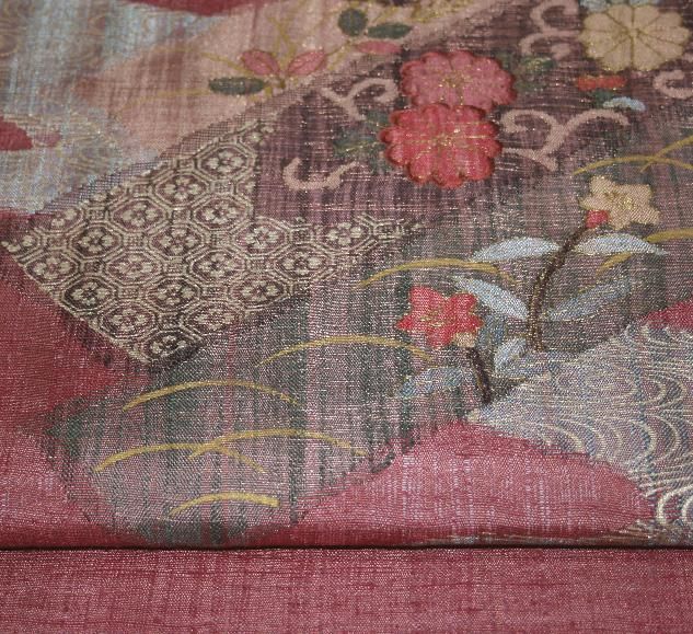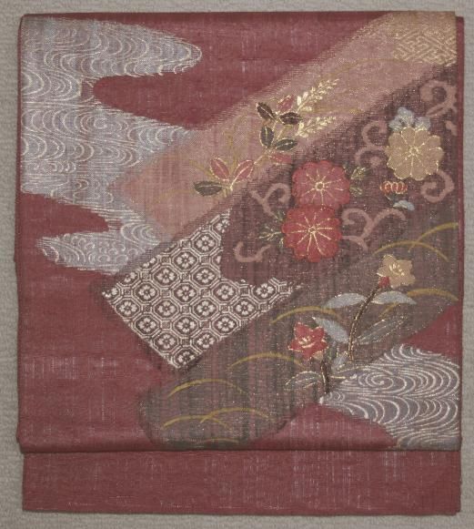 渋い赤紅檜皮色、すくい織のしゃれ袋帯です
